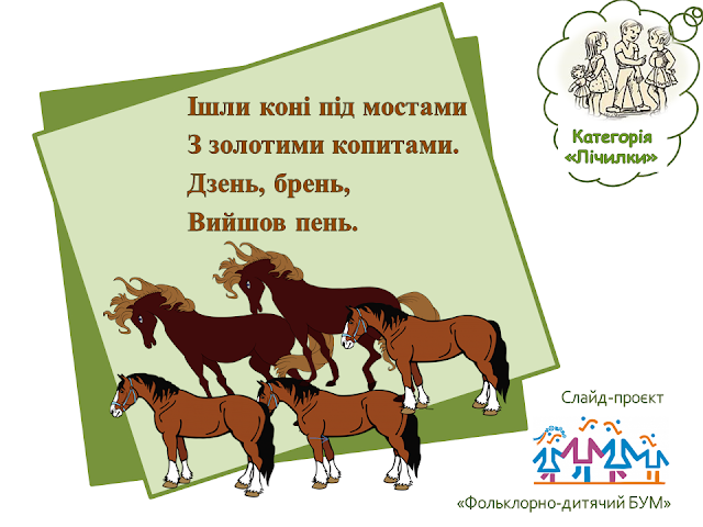 «Мирилки», «Скоромовки», «Колисанки», «Лічилки», «Заклички», «Небилиці» …